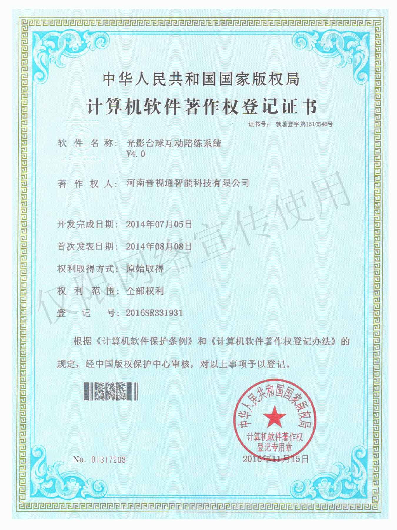 2016年11月15号我公司取得由中华人名共和国国家版权局颁布的光影台球互动陪练系统V4.0版计算机软件著作权等级证书。