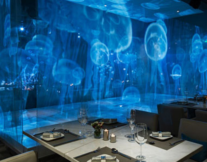 不同于传统的餐厅那样呆板无趣,运用了全息投影的餐厅总是这样能给你惊喜,能给你不同的视觉体验和就餐体验。