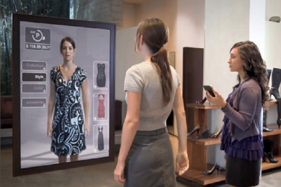 “虚拟试衣”是通过红外感应技术捕捉人的轮廓和手势控制技术进行触点选择,根据人距离的远近和身材的大小将衣服贴合地“穿”在身上,让消费者们在逛商店的同时体验互动,通过“虚拟试衣”不需要脱衣就可以完成衣服的试穿和选择。