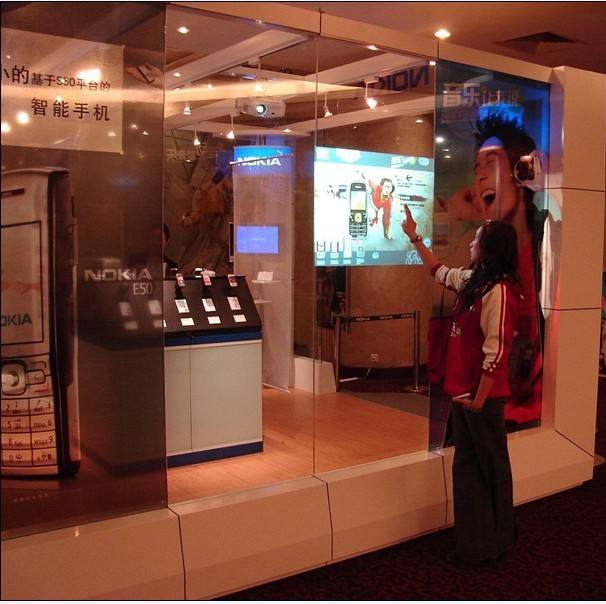 普视通智能科技将图像投射到玻璃橱窗上,用户只需在玻璃表面点击图像画面,系统即可感应到用户手指的动作,并对手指位置进行精确定位,并控制图像配合用户的动作进行变换如放大、缩小、移动、旋转等。摆脱了对鼠标键盘的使用,实现了一种完全不同的交互方式。互动橱窗设备可将图像投射到商户临街玻璃橱窗的普通玻璃上(所有互动橱窗设备都放置在店内,画面尺寸不限),顾客在店外隔着玻璃点击图像画面,在店内的互动橱窗设备可感应到顾客手指的动作,并对手指位置进行精确定位,控制图像配合用户的运作进行变换,进而使商户普通的玻璃橱窗变成超大尺寸的互动广告触摸屏。
